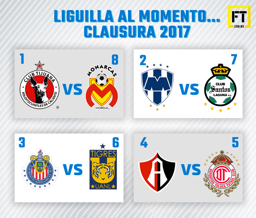 Tijuana, Monterrey, Atlas, Guadalajara, Toluca, Tigres, Santos Laguna y Morelia disputarán la Liguilla del Clausura 2017 en la pelea por el título. Solo queda definir, en que posición quedan Toluca y Santos, que este domingo disputan los dos últimos partidos de la Jornada 17.