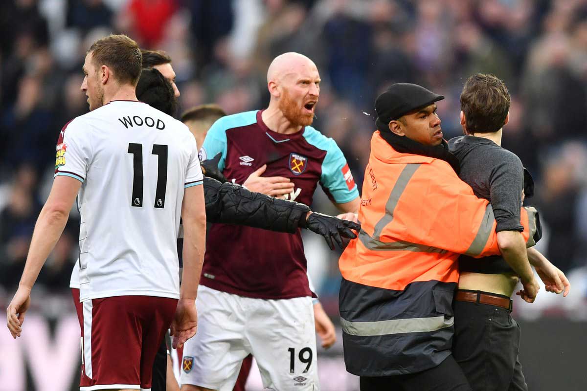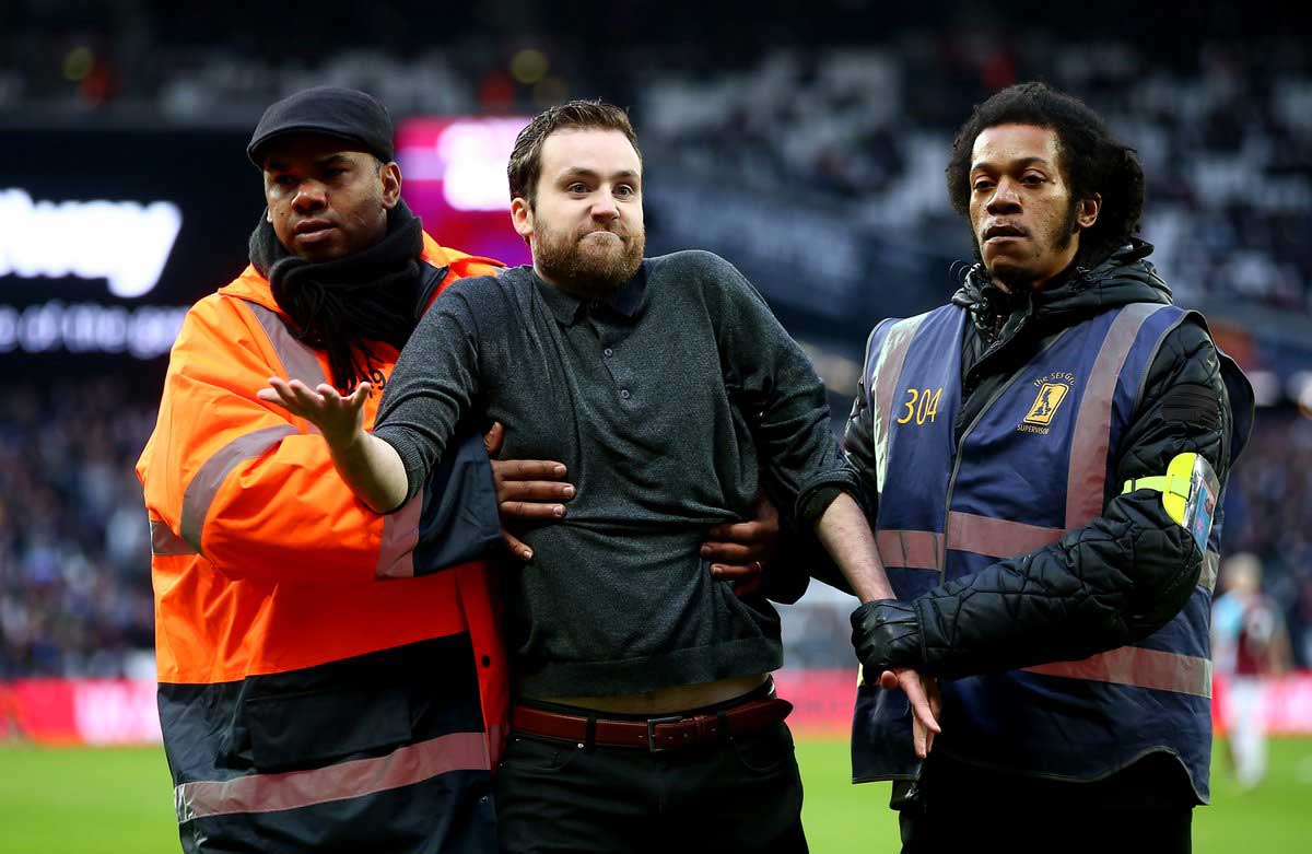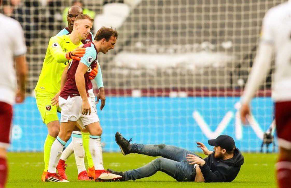 Los aficionados ya estaban hirviendo mientras veían caer a su equipo y ya protestaban en las tribunas a los propietarios del club, lo que no se esperaba es que algunos de ellos saltaran a la cancha para encarar a los futbolistas, uno de ellos, Mark Noble incluso intentaba expulsar a uno del terreno de juego. Otro aficionado tomó el banderín de córner y lo ondeaba en el mediocampo.